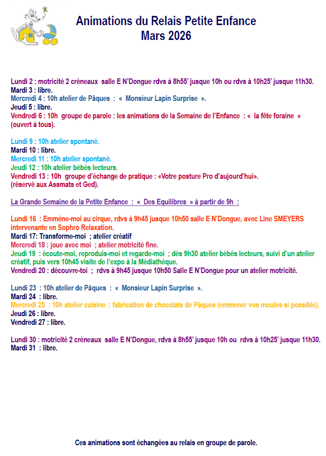 - des moments de partage avec des animations, discutées entre familles et professionnel(le)s (groupe de parole). Ces temps peuvent être partagés entre la crèche, la MAM, ainsi que tous professionnels de l’accueil du jeune enfant.